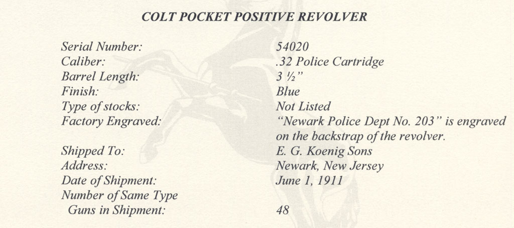 Colt Pocket Positive Serial Number 54020 (ca. 1911) -Factory letter confirms the caliber, 3 1/2" barrel length and engraved inscription "Newark Police Dept No 203" on the backstrap of the revolver as well as shipment to E.G. Koenig Sons, Newark, New Jersey, June 1, 1911 as one of a shipment of 48 guns.