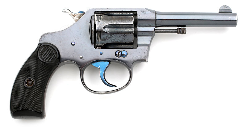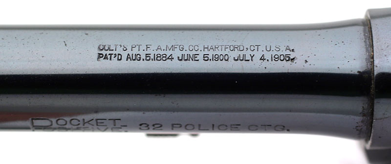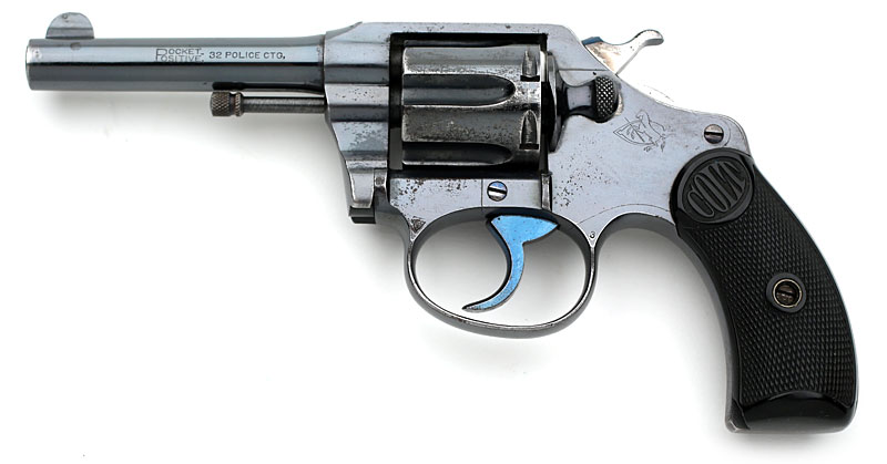 Colt Pocket Positive Serial Number 54020 (ca. 1911) -  .32 Police caliber with 3 1/2" barrel, blue finish with fire blue accents and checkered hard rubber Colt stocks.  Backstrap is factory inscribed "Newark Police No. 203"