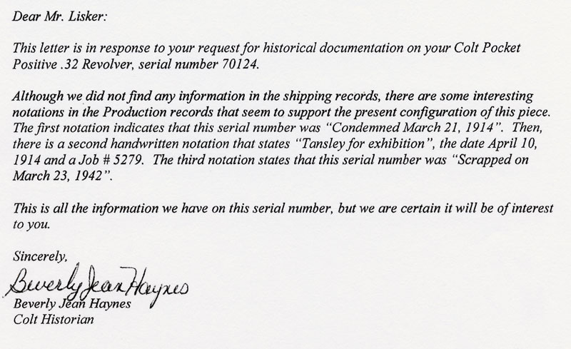 Colt Pocket Positive .32 Police Ctg. Serial Number 70124