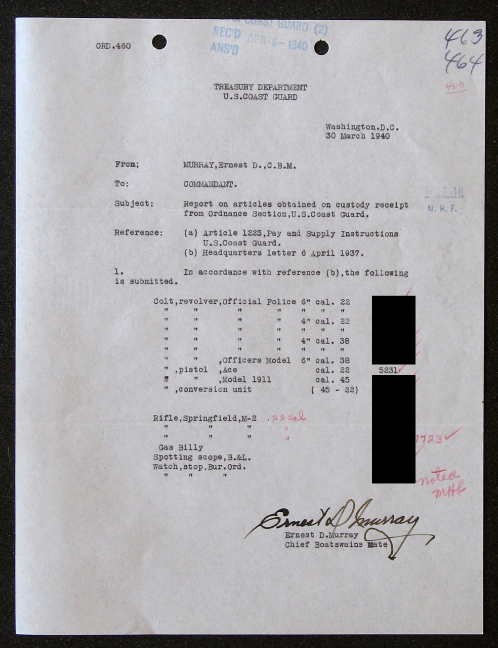 National Archives Records for Colt Ace serial number 5241.