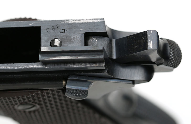 the pistol. His initials were stamped on the left side of the