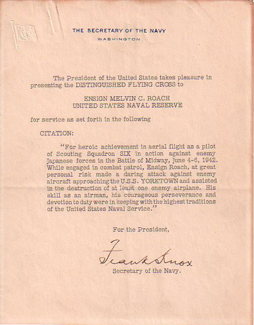 Flying Cross citation presented to Ensign Melvin C. Roach,