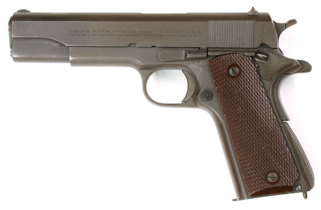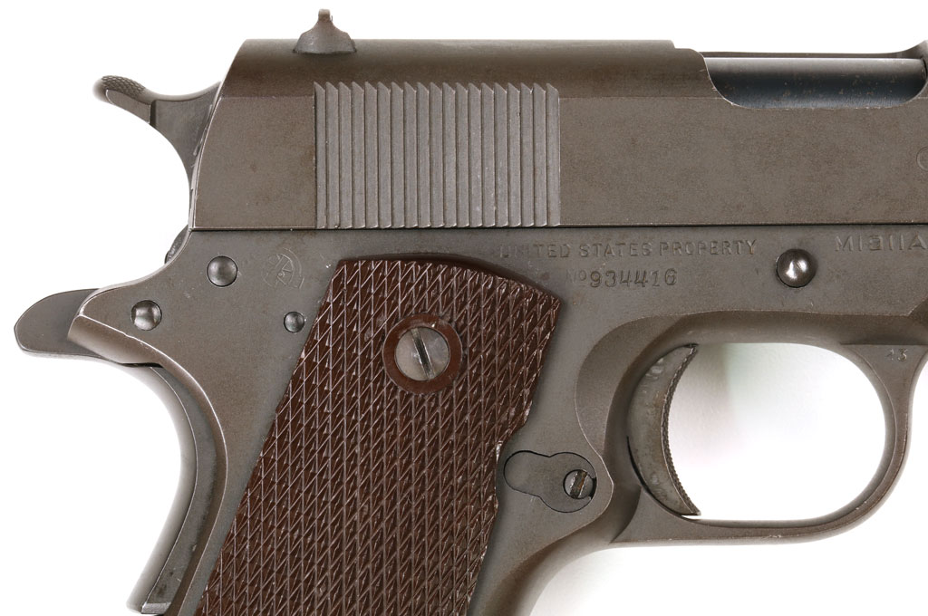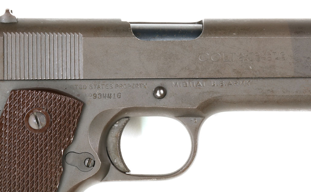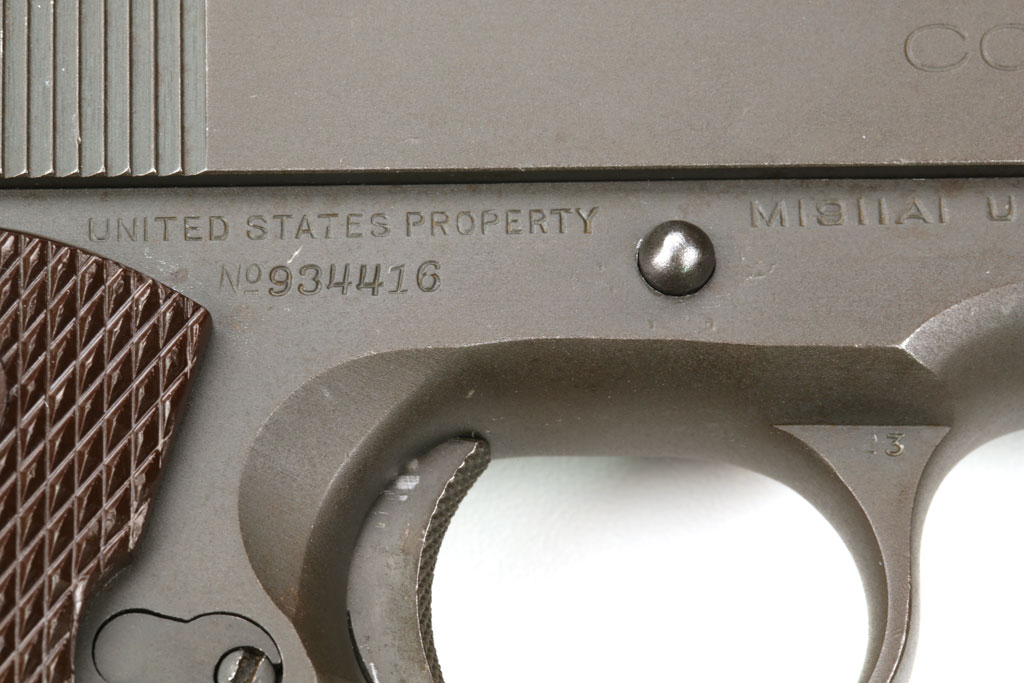 Colt Model 1911A1 U.S. Army .45 ACP Commercial/Military Serial Number 934416 - 1943 production, with commercial slide (note commercial slide  markings on the right side). Pistol has matching numbered slide with cutout for the Swartz Safety and parkerized finish.