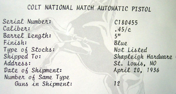 Colt National Match Automatic Pistol - Serial number C180455 was one of 12 guns shipped to Shapleigh Hardware Co., St. Louis, Missouri, April 20, 1936.