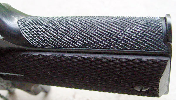Colt National Match Serial Number C194636 with adjustable sights, blued finish, Swartz Safety, checkered walnut grips and special order factory checkered front grip strap.  Photo of checkering used on p. 76 of Colt .45 Government Models by Clawson.