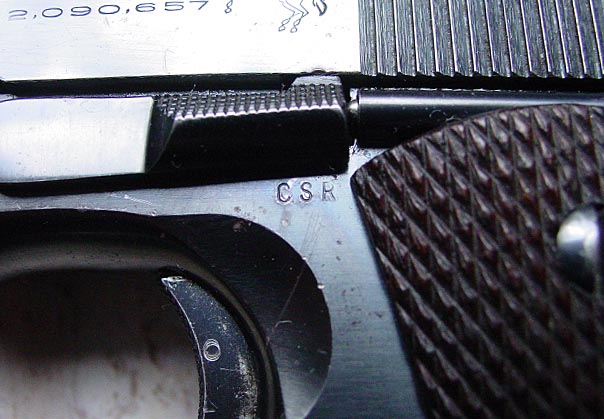The initials of Major Charles S. Reed, Officer in Charge of Outside Inspection, were stamped on all M1911A1 pistols and some Service Model Ace pistols manufactured in 1940-41, signifying government acceptance of the pistol.  His initials were stamped on the left side of the receiver below the slide stop in accordance with Ordnance drawings.  It is also stamped on the top of the receiver near the disconnector hole with a "G".  On the C.S.R. inspected M1911A1 pistols, the mark near the disconnector is an "R" in a circle.