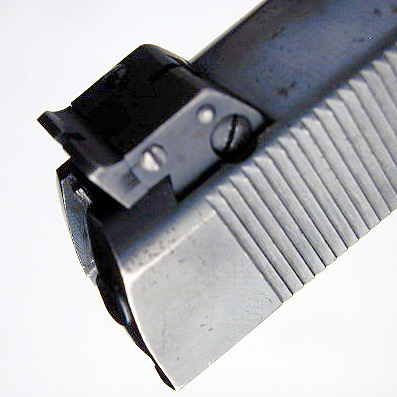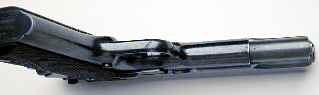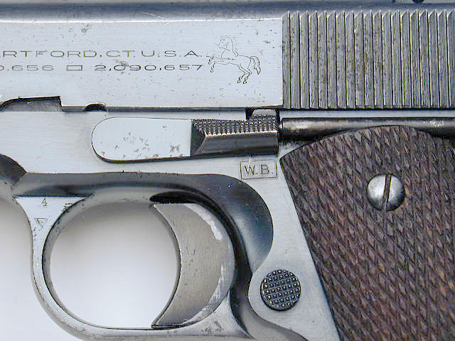 Close-up of the W.B. ordnance mark.  Pistol is fitted with a M1911 trigger.