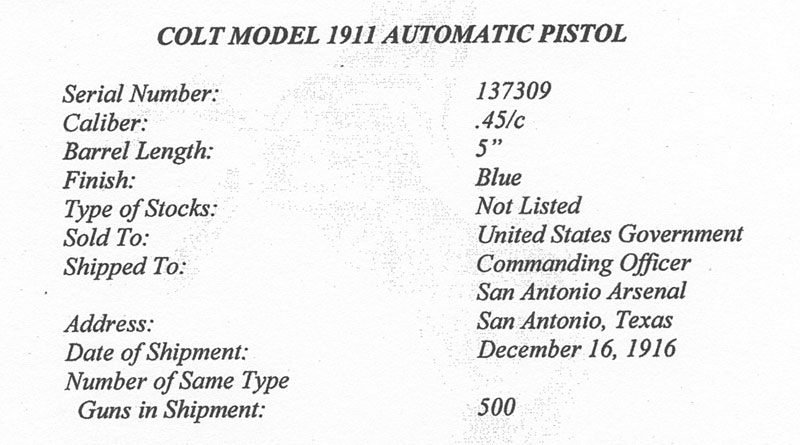 1916) - This Colt 1911 was one of 500 pistols (136901 - 137400) shipped