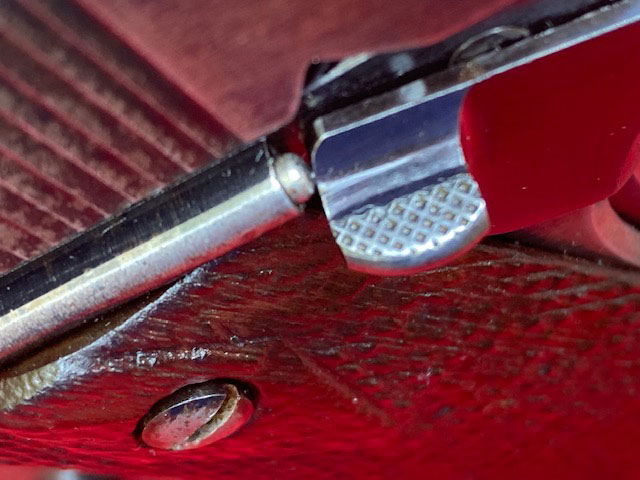pressed-in thumb serrations, vs. the checkering typically seen on this part.