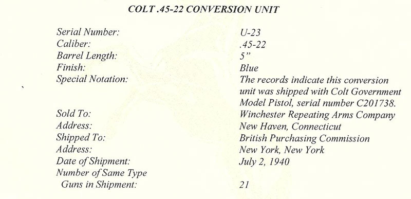 This unit was sold to the Winchester Repeating Arms Company, New Haven, Connecticut and was shipped to The British Purchasing Commission, New York, New York on July 2, 1940.  Special Notation:  The records indicate this conversion unit was shipped with Colt Government Model Pistol, serial number C201738.  There were 21 guns in shipment.