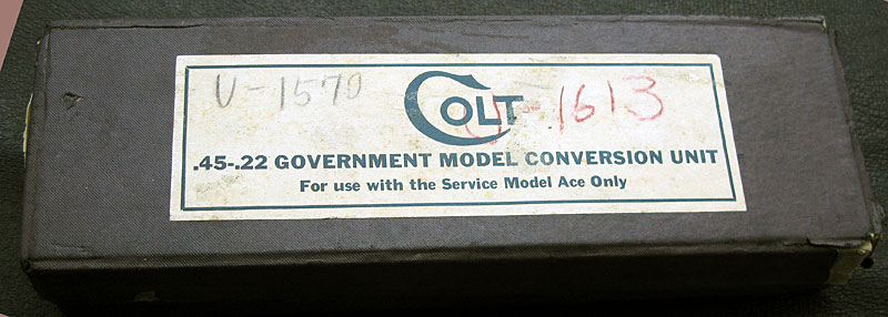 Label on top of box indicated .42-.22 Government Model Conversion Unit, For use with the Service Model Ace Only.  The lid label contains two serial numbers for .22-.45 conversion units.  U-1570 in dark pencil (a standard serial number marking) and U-1613 in red pencil (which is a non-standard serial number marking for this type of box.)  Both of these numbers are so late that this box may have been for a USMC shipped conversion unit.