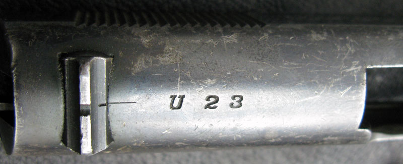 Colt .45 -.22 Conversion Unit serial number U23 - An most unusual and early British Proof Marked example of the .45-.22 conversion unit with fixed sights that was used to convert the Service Model Ace from .22 LR to .45 ACP.  Most of these units were shipped with the Stevens adjustable sight and were unnumbered under the firing pin stop.