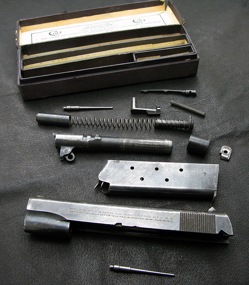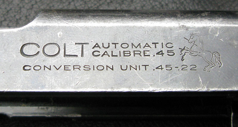 A close-up photo of the markings on the right side of the slide, "Colt Automatic Calibre .45" over "Conversion Unit .45-.22"
