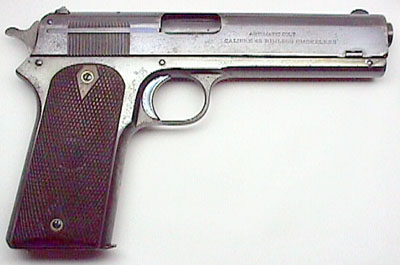 Model 1905 serial number 5473. A very unique Model 1905 with an interesting history. The pistol is inscribed "Col. John Caswell" on the backstrap and is complete with the original holster. The Colt Factory Letter indicates that this pistol was a one gun shipment shipped on July 11, 1911 to Von Lengerke & Detmold, 349 Madison Avenue, New York, NY. The history behind this gun is that it was special ordered by Col. Caswell to take on an African safari. While on the safari, his hunting party was attacked by natives and Caswell had to use this Model 1905 to defend himself. He was so disturbed by what transpired that when he returned to the States, he eventually gave the gun to a friend of his who was the president of a bank in South Carolina. The gun remained in the same family for more than two generations.