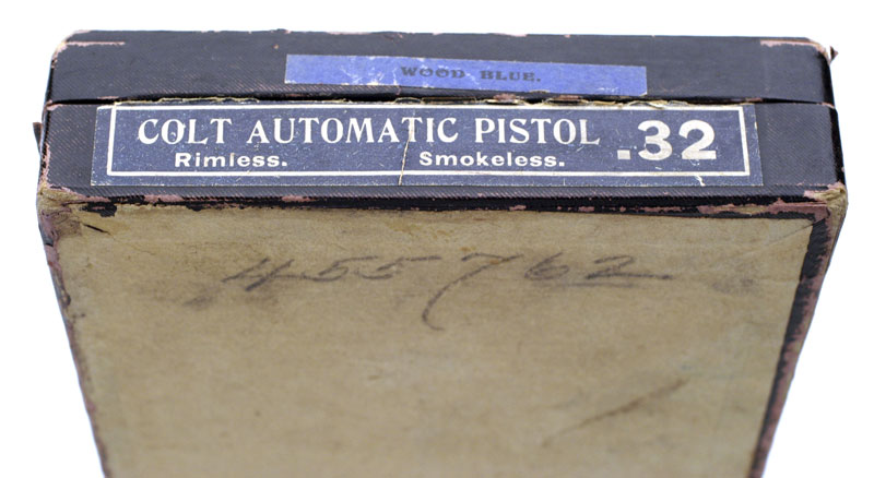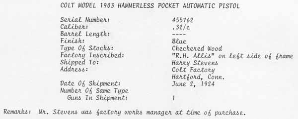 Aside from the factory inscription, another feature that makes this pistol extremely unique is the presence of forward facing flush nickel silver grip medallions. When viewing either side of the pistol, the horse on the grip medallion faces the front of the pistol. The earliest pistols produced with these grips had the "WOOD BLUE" label on the upper end flap of the box. These labels were used for a very short period of time until the checkered walnut grips became the standard grips for this model. The pistol was shipped to Harry Stevens (of Stevens Sight fame) at Colt Patent Fire Arms Mfg. Co in 1924. Mr. Stevens was Factory Works Manager at the time of shipment.