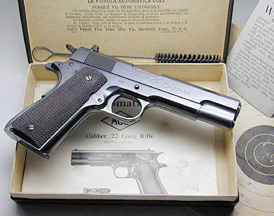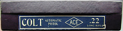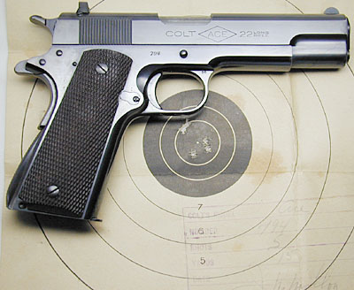 Colt Ace serial number 794 - Pistol was shipped July 10, 1931 as a single gun shipment. Sold to Postman Sporting Goods Company, Shipped to Clark Smith Hardware Company, Peoria, Illinois. Pictured with its original box, test target numbered to the gun, instructions, special instructions and cleaning brush. The Ace model was a limited production pistol with just under 11,000 guns produced. This Ace and its original box are in excellent condition.