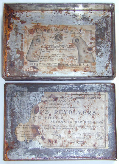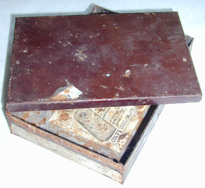 Tin Shipping Box - In 1915, Colt's used a tin two piece shipping box for some overseas (Belgian) and domestic shipments. The boxes were painted maroon (to resemble the standard cardboard hinged shipping box) and contained the standard labels of the day. The end label extended under the bottom of the box so that the serial number could be hand written in the standard location.