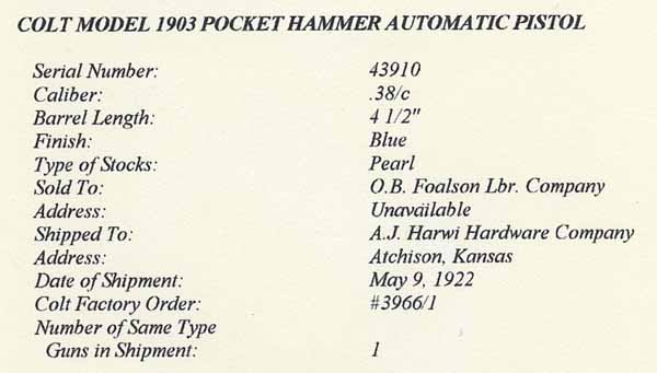 Colt 1903 Pocket Hammer .38 ACP serial number 43910 - right side.