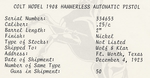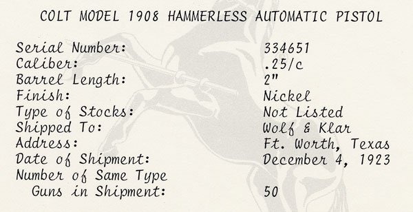 Colt Model 1908 Vest Pocket .25 ACP factory letter for serial number 334651.