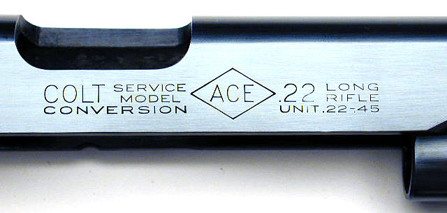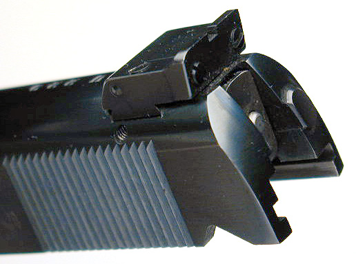 View of rear sight, numbered slide and two-tone conversion unit magazine.
