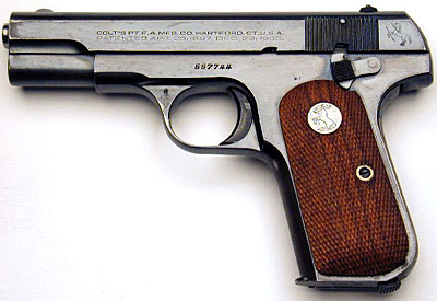 Copy of Colt Factory Letter. ![]() 1903 Colt .32 ACP serial number 557744 - close-up of flaming bomb ordnance mark. ![]() Right side of Colt Model M .32 ACP serial number 557744. Note the lack of the "U.S. PROPERTY" marking on the right side of the frame. |