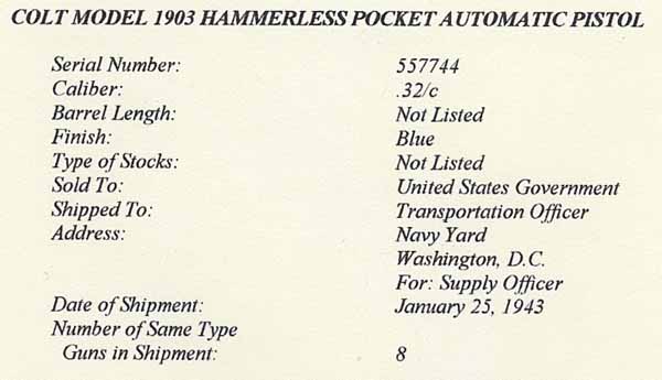 ![]() Colt Navy Contract Model M pistol serial number 557744 in .32 caliber. This blued .32 is one of 56 Model M .32 ACP pistols in the serial number range 551446 - 558605 that were shipped to the Norfolk and Washington Navy Yards between 3/24/42 and 1/25/43. This pistol was shipped on 1/25/43 in a shipment of 8 guns "to the transportation officer, Navy Yard, Washington, D.C. for the supply officer." It has the distinguishing characteristic of having a flaming bomb ordnance mark on the upper left flat of the trigger guard. It is believed that none of the 56 pistols have the "U.S. Property" roll mark on the right side of the frame.