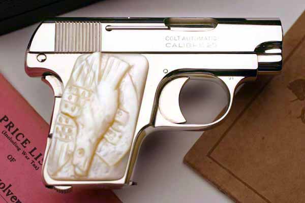 Colt Model 1908 Vest Pocket sn 364025 Factory Nickel Plated with Carved Eagle Mother of Pearl grips - Pistol is cased in Colt factory presentation case and features a relief carved eagle on the right grip.  The left grip is a standard mother of pearl grip with medallion.  Factory carved mother of pearl grips are an extremely scarce variation to locate for this particular model of Colt pistol.  In 1921, these grips were a $9.00 option on a gun that retailed for $16.50, bringing the total cost to $25.50.