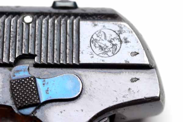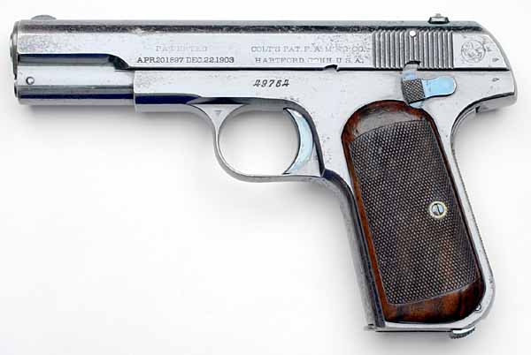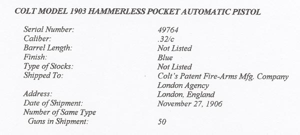 Colt Model 1903 Pocket Hammerless Type I serial number 49764 - with factory checkered grip safety and deluxe checkered walnut grips. Pistol has high polish finish and fire blued small parts. Gun also has British Proof marks. Colt Factory Letter indicates that this pistol was shipped to Colt's Patent Fire Arms Manufacturing Company, London Agency, London, England on November 27, 1906. There were 50 guns in the shipment.
