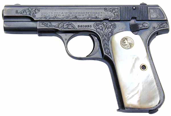 Colt 1903 .32 serial number 503095 – Factory engraved "A", blued finish, mother of pearl grips. Shipped January 18, 1930. Pistol was owned by Mr. Mauro Falletta who obtained it in 1930. Mauro Falletta emigrated from Sicily in the 1890s and began work in the Cadillac plant as an upholstery installer. He became interested in real estate and eventually owned a real estate company and an oil company that delivered home heating oil. During WWII, he served as the local air raid marshal. He Lived to the age of 101. The factory letter confirms the engraving as Class "A" but does not list the mother of pearl grips. This pistol was shipped on January 18, 1930 to Mr. Fred Moore at the Colt Armory in a single gun shipment and was processed on Colt Factory Order Number 17702/1. The letter includes a remark: "It is of interest to note that Mr. Fred Moore was employed by the Colt Company serving as Assistant Superintendent and later Superintendent of Machine Gun production."