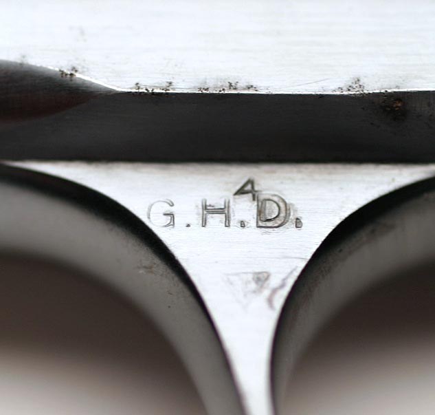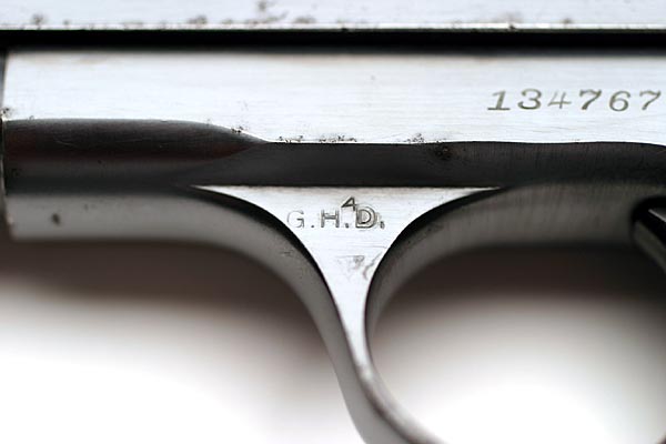 Colt 1908 Pocket Hammerless .380 ACP serial number 134767 G.H.D. Inspected - G.H.D. marking on upper left flat of the trigger guard. G.H.D. ordnance mark is for Brig. General Guy H. Drewry, Springfield Ordnance District, Army Inspector of Ordnance, June 17, 1942 to July 15, 1945. Colt 1908 Pocket Hammerless .380 ACP serial number 134767 G.H.D. Inspected - Close-up of G.H.D.