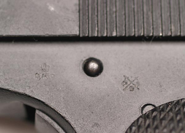 | Dutch Contract Model M .32 ACP serial number 545266 - British proof marks on right side of frame. |
