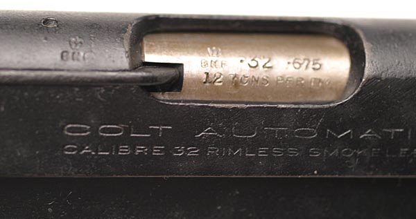 | Dutch Contract Model M .32 ACP serial number 545266 - British proof marks on top of slide and barrel (through ejection port). |