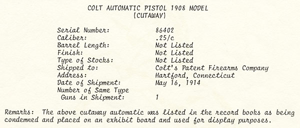 In examining a Colt factory display board, it is noted that the arms were all cut away on the back to fit flush against the fabric backing. Barrels were further cut away to avoid potential problems with crossing borders. Factory ledgers occasionally state that these cut away pistols are "condemned" meaning that they were rendered inoperable.