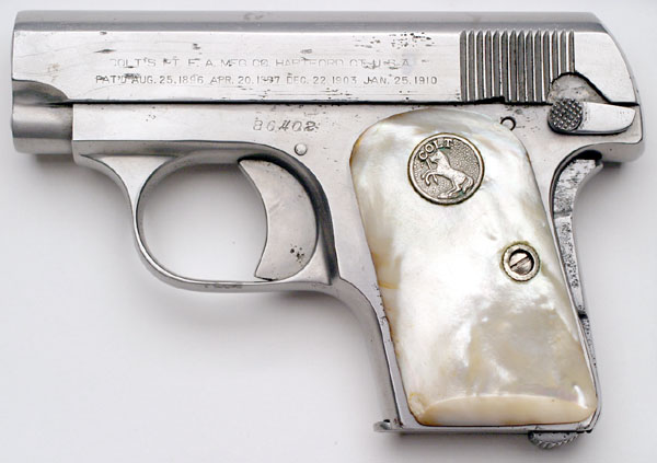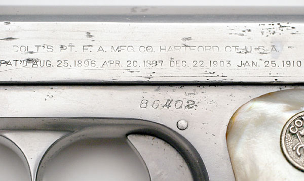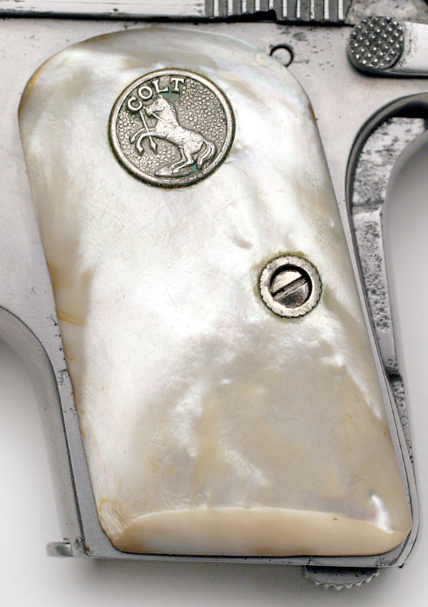 Early style round top mother of pearl grip with later-1923 style flush medallion.