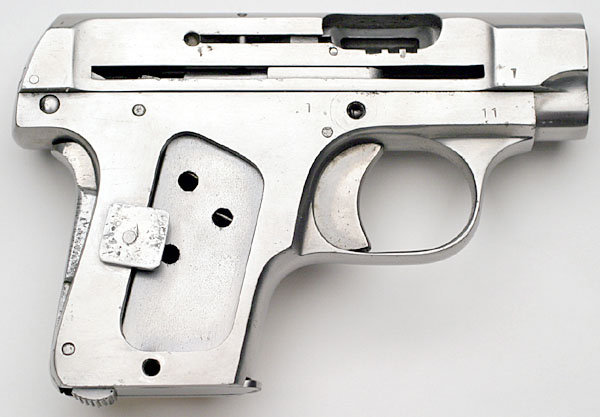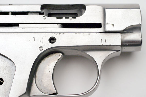 Slide and Frame are each numbered "1" with number "11" stamped above the trigger guard on the right side. It is suspected that the "1" were used to match to the slide and frame and the number "11" is for the location of the gun on the board. There are two threaded screw holes in the right side of the frame (at the opening of the magazine well and above the trigger) that were used to attach the gun to a Colt Factory Exhibit Board.