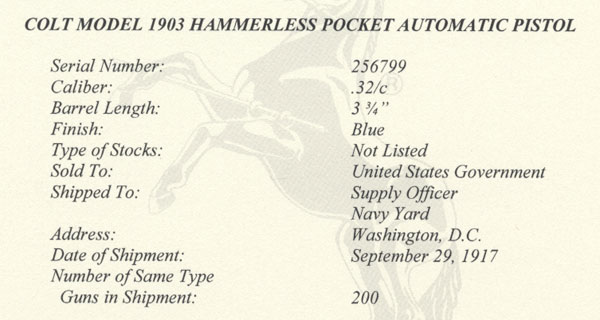 WWI Navy Colt Model M .32 ACP serial number 256799 - From the beginning of production until WWI, there was only one significant military order for the Model M. It was a 200 gun shipment ranging in serial number from 227226 to 260924 on September 29, 1917 to the U.S. Navy Yard, Washington, DC. Serial number 256799 is documented as having been part of this Navy shipment. These pistols had no special government ordnance, inspectors or acceptance markings applied at the factory.