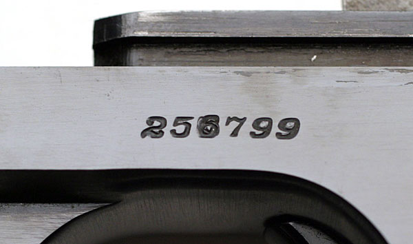 256799 Serial Number Close-up - notice how the third number from the left has been over struck. This is from a serial number error when this gun was numbered during production.