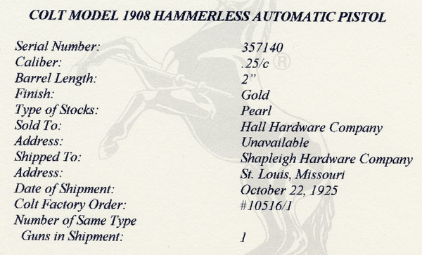 Colt 1908 Vest Pocket .25 ACP serial number 357140 - gold present