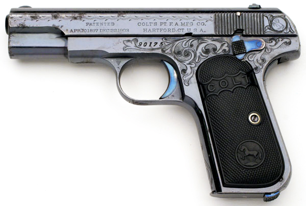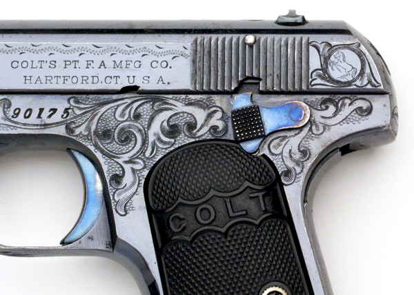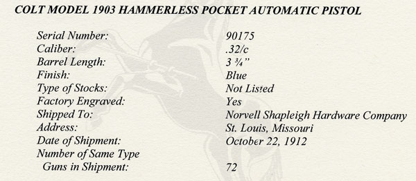Factory "A" Engraved Colt Model M .32 ACP - serial number 90175. Pistol was shipped blued, factory engraved with hard rubber grips. An unusual example as it contains all early Type III features even though it's in the Type II serial number range (approx. 72,000 - 105,000). Pistols in this range typically have a 3 3/4" barrel with separate barrel bushing. This pistol was one of 72 shipped October 22, 1912 to Norvell Shapleigh Hardware Company, St. Louis, Missouri.