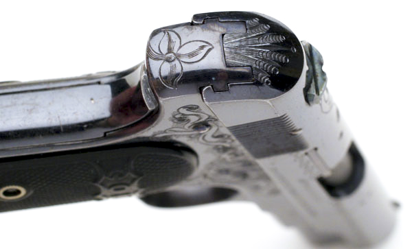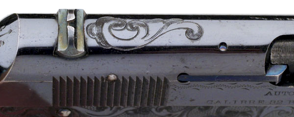 Close-up of engraving and fire blued small parts on left side. |