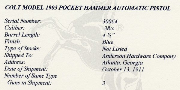 Colt 1903 Pocket Hammer Serial Number 30064 - An early Model 1903 Pocket Hammer in original condition with high polish blue and fire blue small parts. Pistol was one of three shipped to Anderson Hardware Company, Atlanta, Georgia on October 13, 1911.