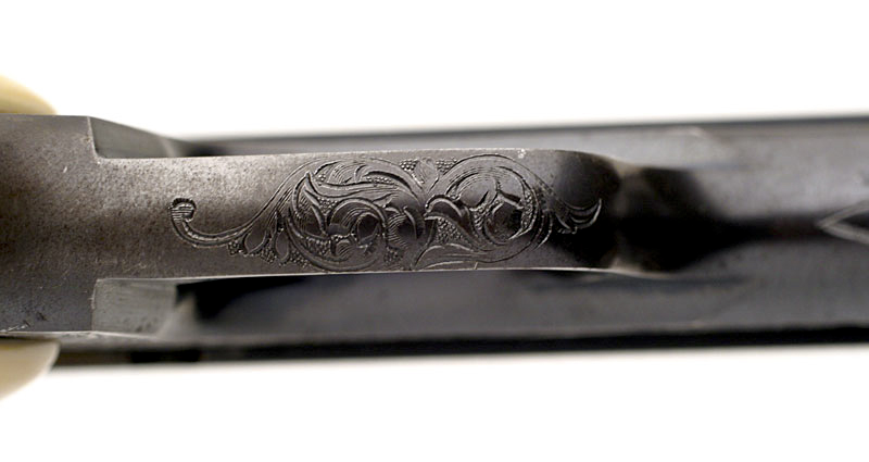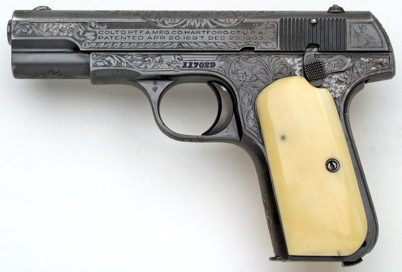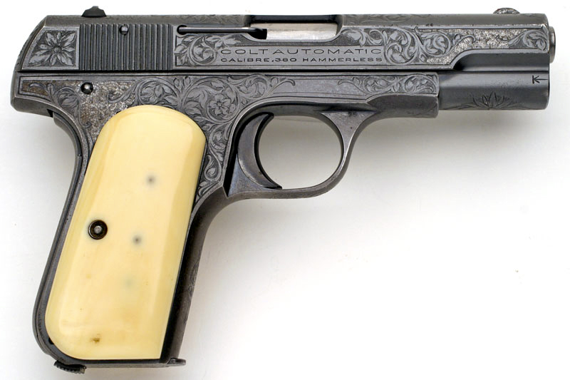 Colt 1908 Pocket Hammerless .380 ACP serial number 117029 - A very unique example with an unusual engraving pattern. This work is believed to have been done by Colt factory master engraver Wilbur Glahn. This pistol has factory "B" coverage, but what makes it most unusual is the engraving treatment on seven areas of the finish. In these areas, the engraving is cut through the blue in order to give the gun the appearance of having engraved silver or platinum inlays. This pistol is also fitted with beautiful period plain ivory grips. The factory letter describes this pistol as having a blue finish, stocks not listed, factory engraved and shipped to Abercrombie & Fitch, May 11, 1933, New York, NY as a single gun shipment on Colt factory order number 12226. (see letter below):