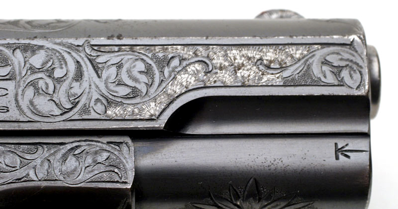 Colt 1908 Pocket Hammerless .380 ACP serial number 117029 - close-up of left side of slide showing engraving cut through the blue on the slide and to the left of the serial number. Notice how the engraved leaves that enter the white engraved areas have a blued finish.