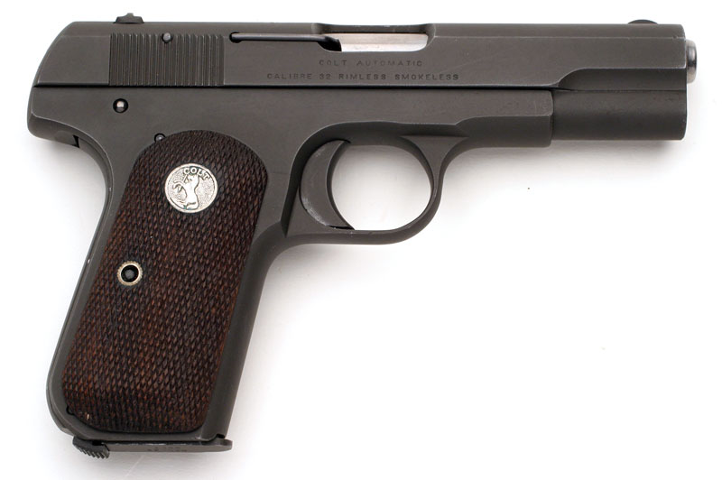Colt Model 1903 Pocket Hammerless .32 ACP serial number 217890 (ca. 1916) inscribed to "M.H. Stedman" on left side of the frame. Pistol was shipped to Andrus & Naedele (sic. Naedle), Hartford, Connecticut on August 17, 1916 in a two gun shipment. Inscription is believe to be factory from both the style and the fact that Morgan Stedman was a Colt employee. (See February 2007 Gun of the Month for another gun shipped to Morgan Stedman). Pistol is parkerized and was presumably refinished at the factory in the 1940s. Barrel is stamped with the gun's serial number 217890 in front of the lugs. Thumb safety is blued as is the extractor. Feed ramp on frame is polished bright.