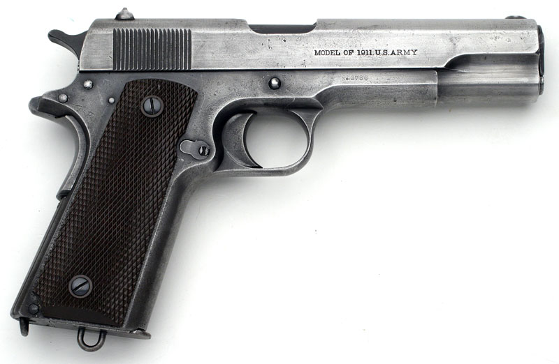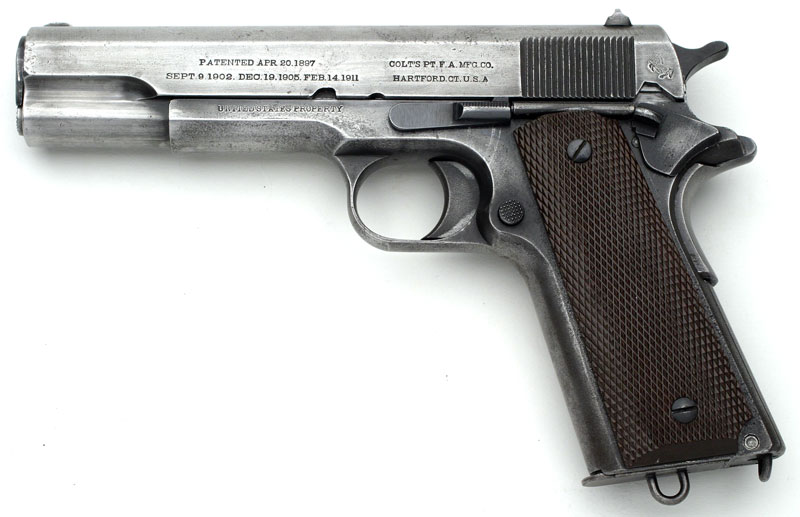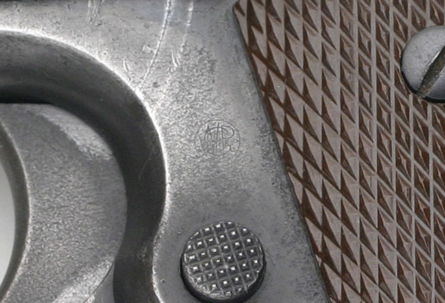 Left side. This example bears the ordnance mark W.G.P., for Major Walter G. Penfield, in the form of a monogram stamped on the left side of the frame above the magazine release. Penfield inspected these pistols from January 2, 1911 - September 30, 1914. Serial numbers of Model 1911 pistols inspected 1 - 101500.