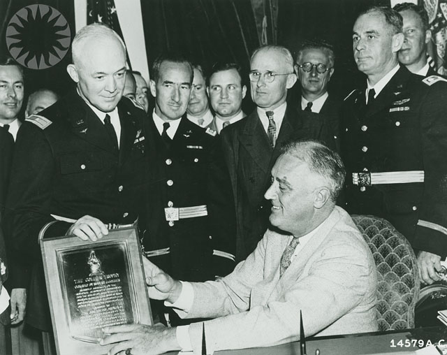 SI Neg. 2000-3735. Date: na...Official USAF caption: Presentation of Collier Trophy for 1937 to U.S. Army Air Corps. President F. D. Roosevelt seated at desk, Gen. H. H. Arnold, accepting. Left to right, front row: Brig. Gen. Henry H. Arnold, Major Carl F. Grune, Dr. John E. Younger, Lt. Col. Oliver P. Echols. Extreme right - back row: Capt. Alfred H. Johnson. [Photo taken 16 September 1938.]..Credit: Unknown. (Smithsonian Institution)