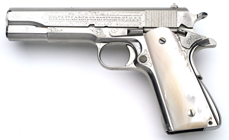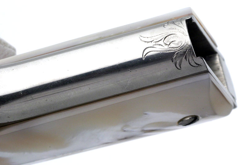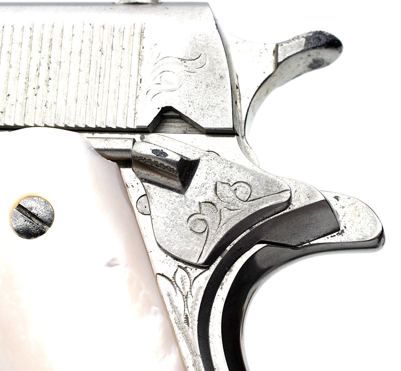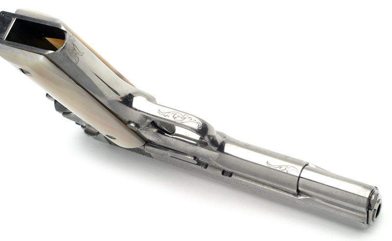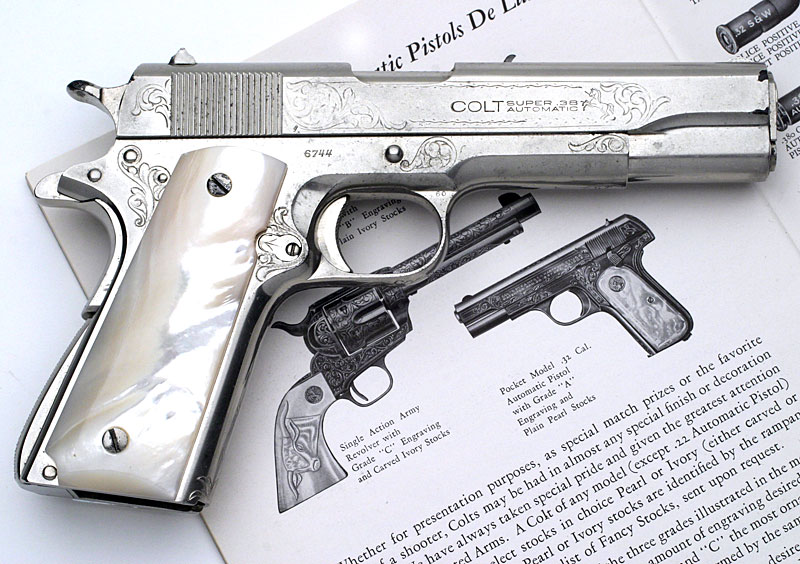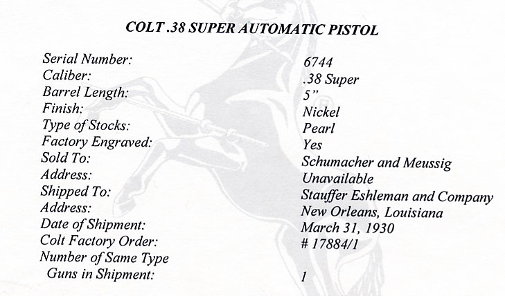 Factory Engraved Colt Super .38 serial number 6744 - factory engraved, factory nickel finish, pearl grips and sold to Schumacher and Meussig, Address unavailable, shipped to Stauffer Eshleman and Company, New Orleans, Louisiana, March 31, 1930, processed on Colt Factory Order #17884/1 in a one gun shipment. This was the second year of production for the Super .38. SCHUMACHER & MUESSIG INC of Galveston, Texas - The firm was registered in 1923 as a domestic for profit corporation for merchandising on January 15, 1923 with capital stock of $7,500. Incorporators: Carl Schumacher, Carl Muessig and John Egert.