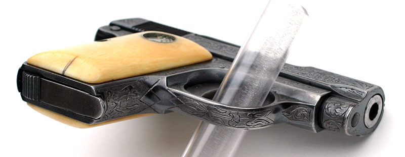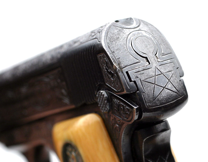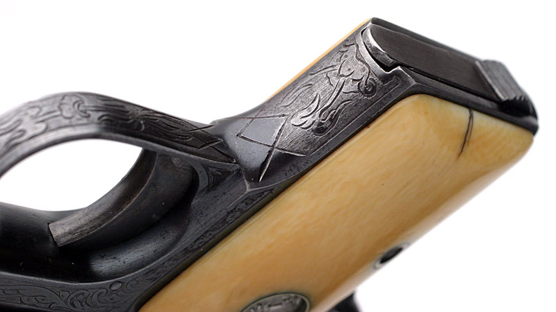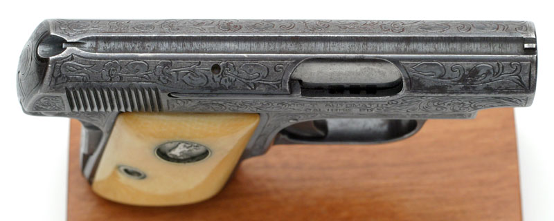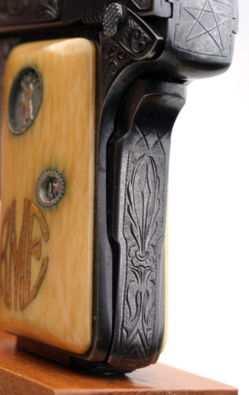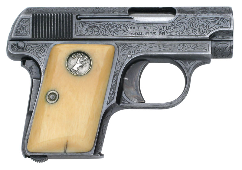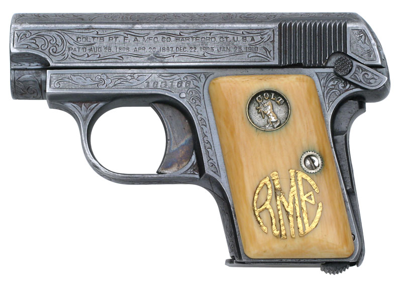 Colt 1908 Vest Pocket .25 ACP Serial Number 163166 Factory Master Engraved by William H. Gough Blue Finish, Gold Inlaid Monogrammed Ivory Stocks - The records indicate this pistol was shipped out as a .25/c, 2", in the Green state for engraving. It was shipped to A.H. Fox Gun Co. in Philadelphia, PA for William H. Gough on April 20, 1917, a shipment of 1 gun.