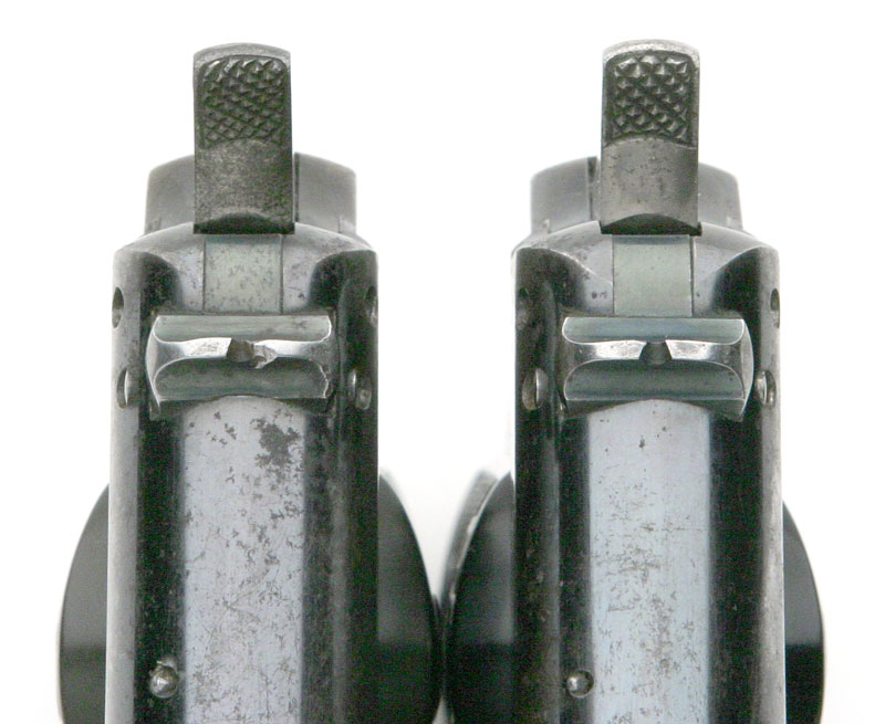 Factory Alteration to Sight Safety - sight safety has been removed and plugged with a piece of steel. A second pin was inserted in the rear of the slide to secure the block. Top of slide was modified with a dovetail to accept the new rear sight. Colt Model 1900 serial number 4018 is pictured on the left and serial number 4264 is pictured on the right. Note the variation in hammer checkering.