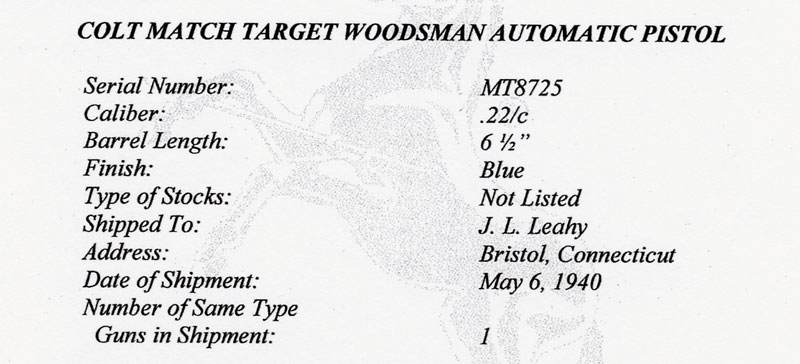 Pistol was a one gun shipment to J.L. Leahy in Bristol, Connecticut on May 6, 1940.